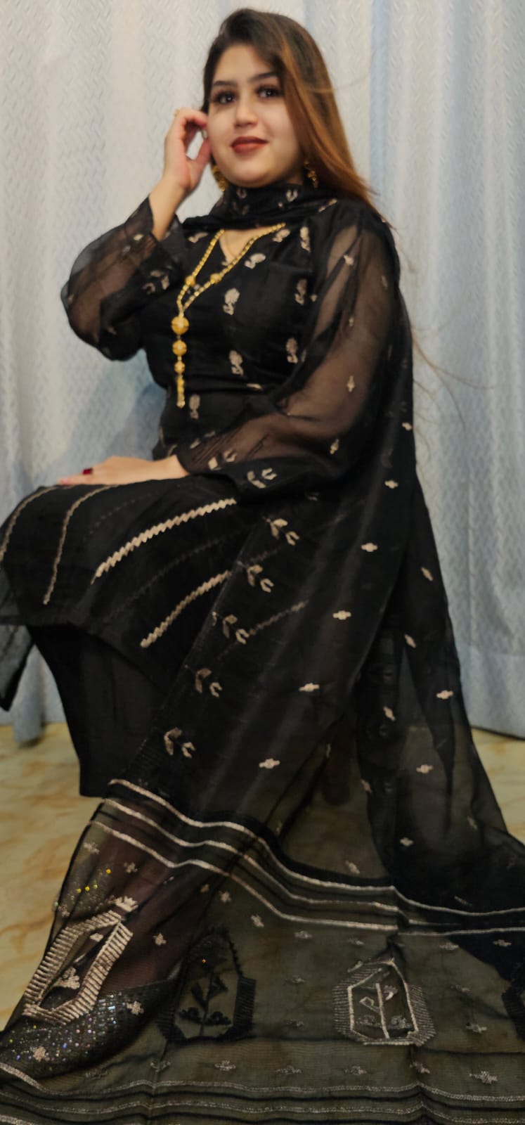 পুরো ড্রেস জুড়ে সূক্ষ্ম জামদানি এমব্রয়ডারি ওয়ার্ক, সঙ্গে স্টাইলিশ পেল্টেড বাটন নেক—যা আপনাকে দেবে রাজকীয় ও গ্রেসফুল লুক।