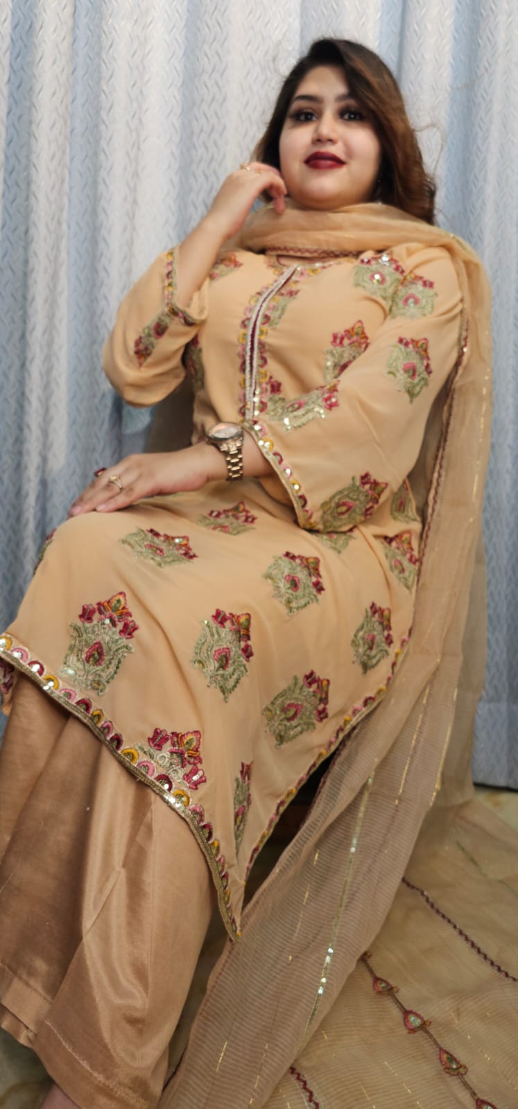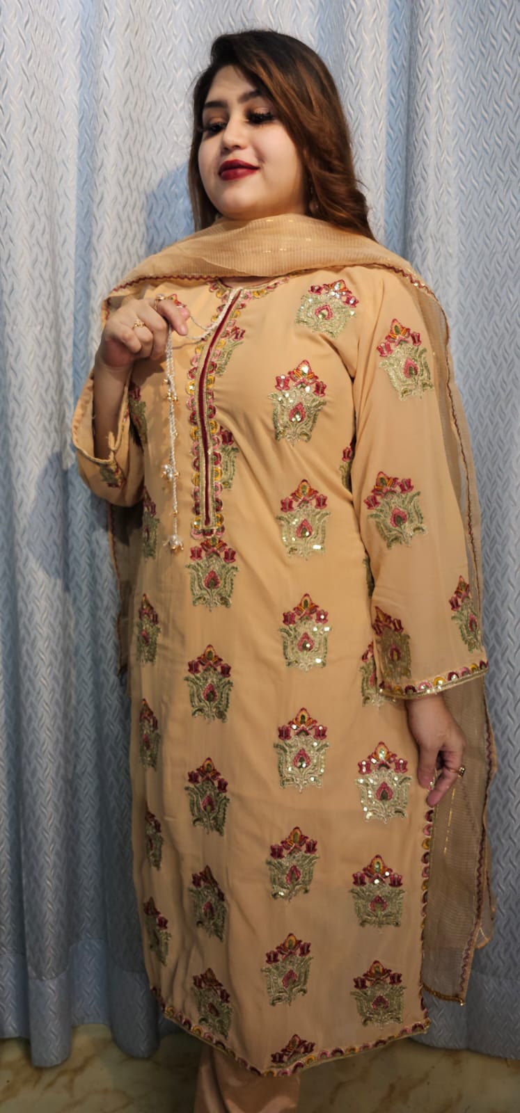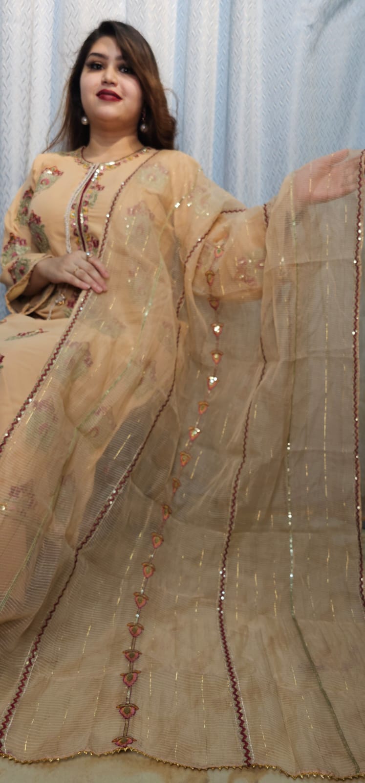 ড্রেস ও কোটা ওড়নায় হেভি এমব্রয়ডারি ও সিকোয়েন্স ওয়ার্ক, গলায় এক্সক্লুসিভ টারসেল ডিটেইল। ফ্রি সাইজ ৪৬ | জামা লম্বা ৪৫।