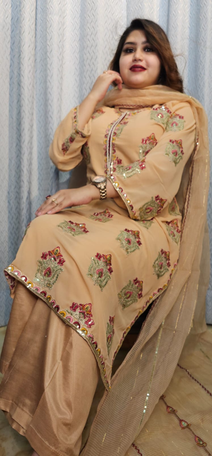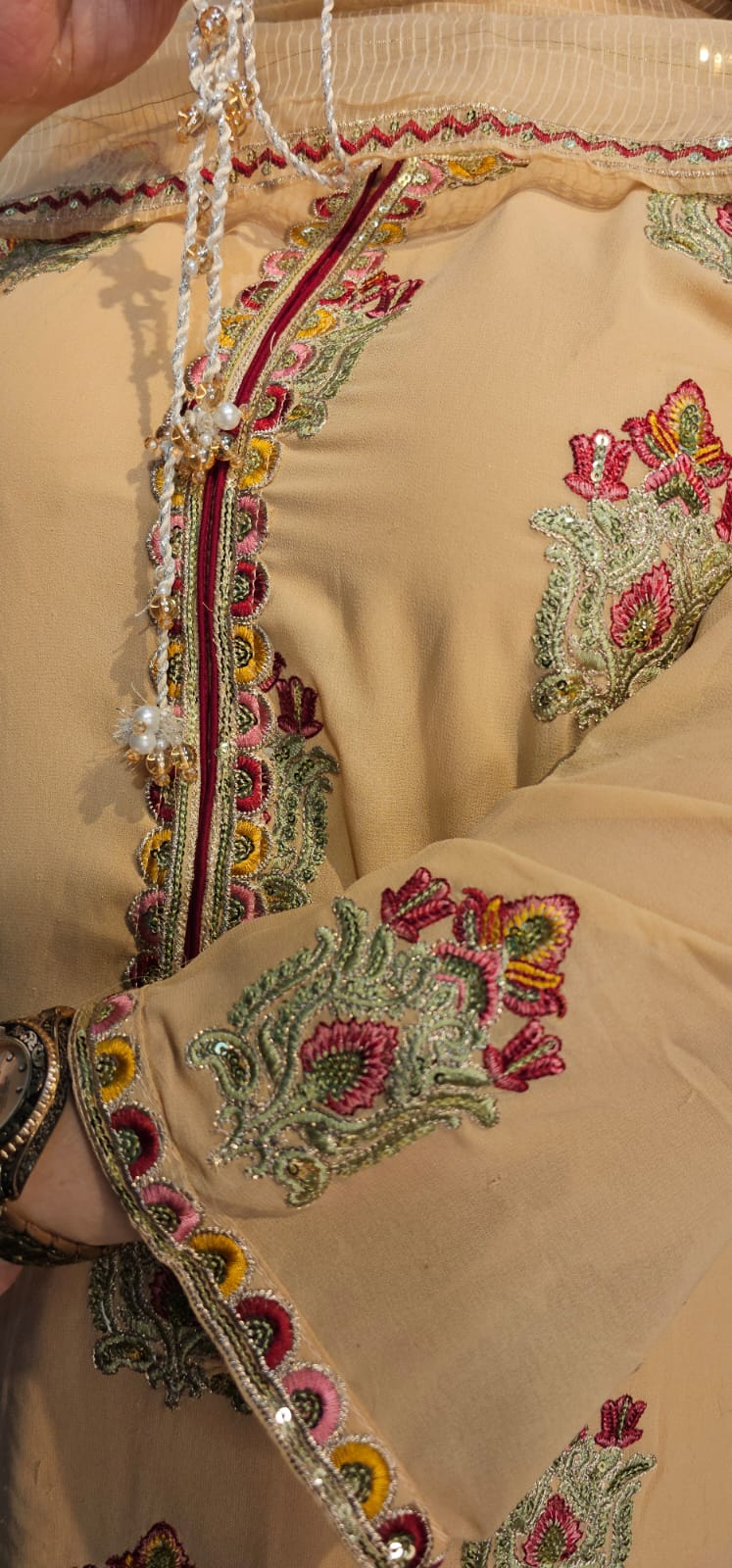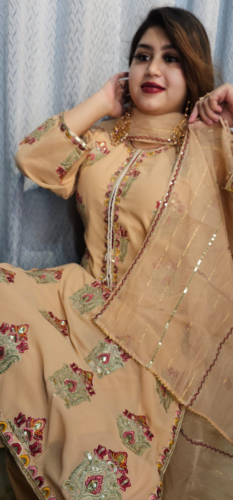 ড্রেস ও কোটা ওড়নায় হেভি এমব্রয়ডারি ও সিকোয়েন্স ওয়ার্ক, গলায় এক্সক্লুসিভ টারসেল ডিটেইল। ফ্রি সাইজ ৪৬ | জামা লম্বা ৪৫।