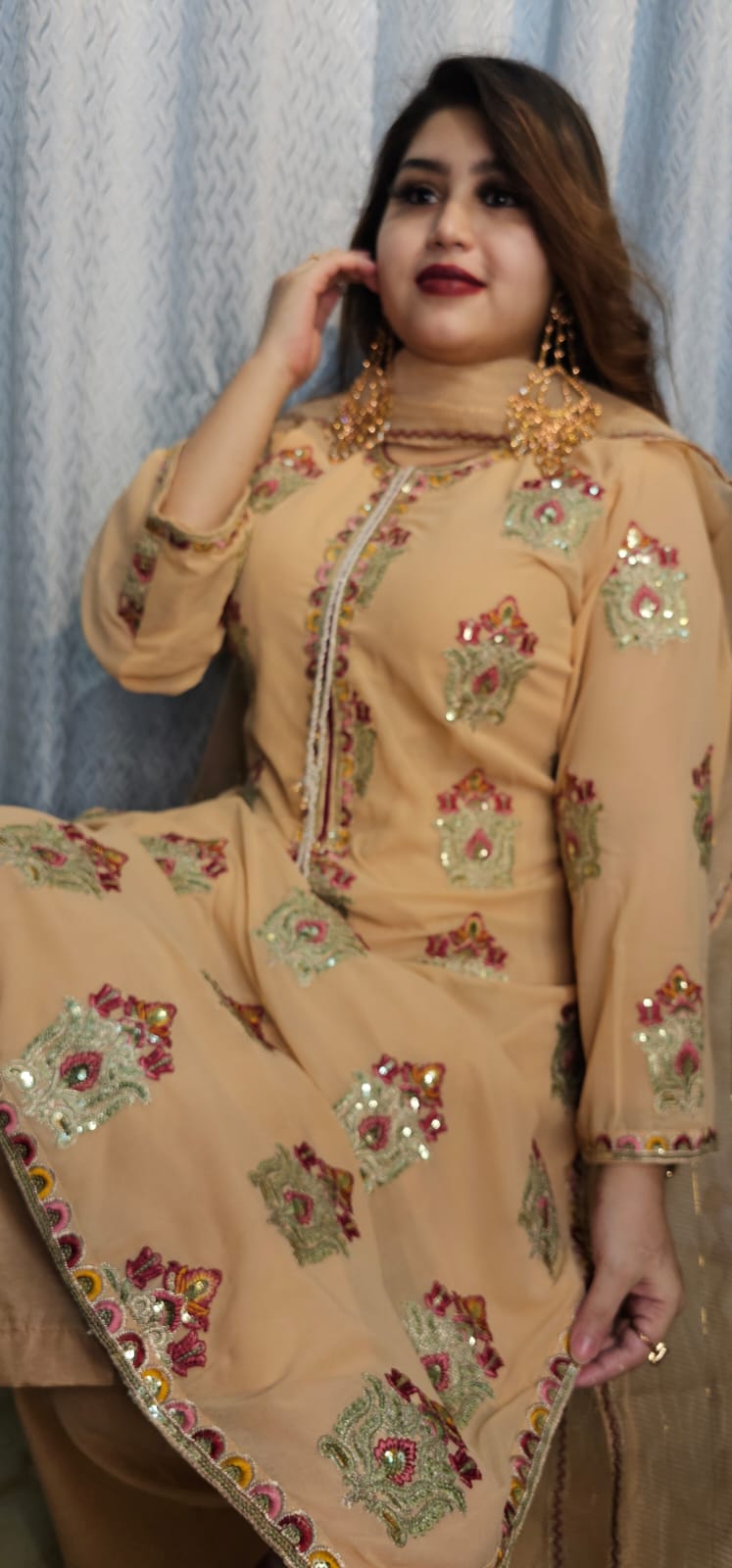 ড্রেস ও কোটা ওড়নায় হেভি এমব্রয়ডারি ও সিকোয়েন্স ওয়ার্ক, গলায় এক্সক্লুসিভ টারসেল ডিটেইল। ফ্রি সাইজ ৪৬ | জামা লম্বা ৪৫।